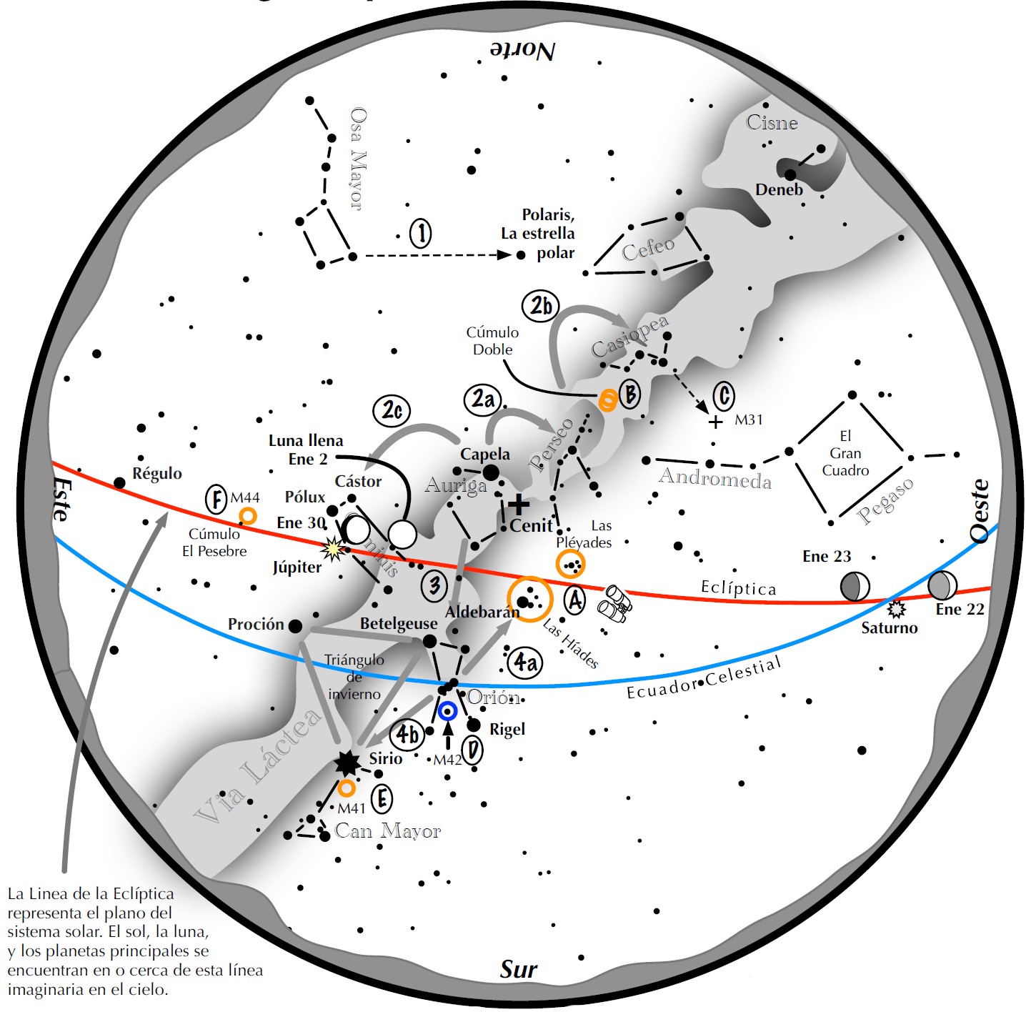 (Este mapa representa el cielo a las 20:00 a principios de enero y a las 19:00 a finales)
