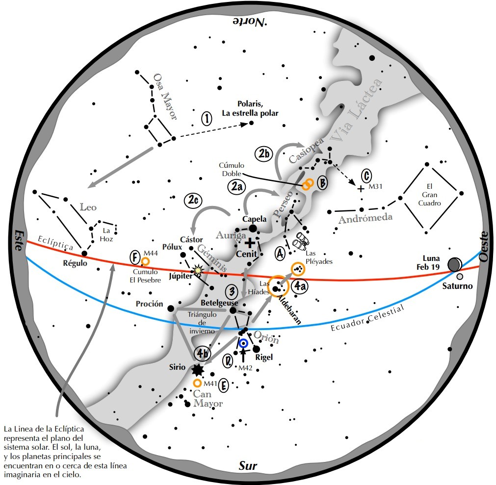 En febrero, el cielo invernal continúa ofreciendo un panorama espectacular durante las largas noches. Uno de sus rasgos más llamativos es el llamado hexágono de invierno, un gran asterismo formado por seis de las estrellas más brillantes del firmamento: Sirius (Canis Mayor), Procyon (Canis Minor), Pollux (Gemini), Capella (Auriga), Aldebaran (Taurus) y Rigel (Orion). Esta figura domina buena parte del cielo al anochecer y sirve como excelente referencia para orientarse entre las principales constelaciones de la estación.